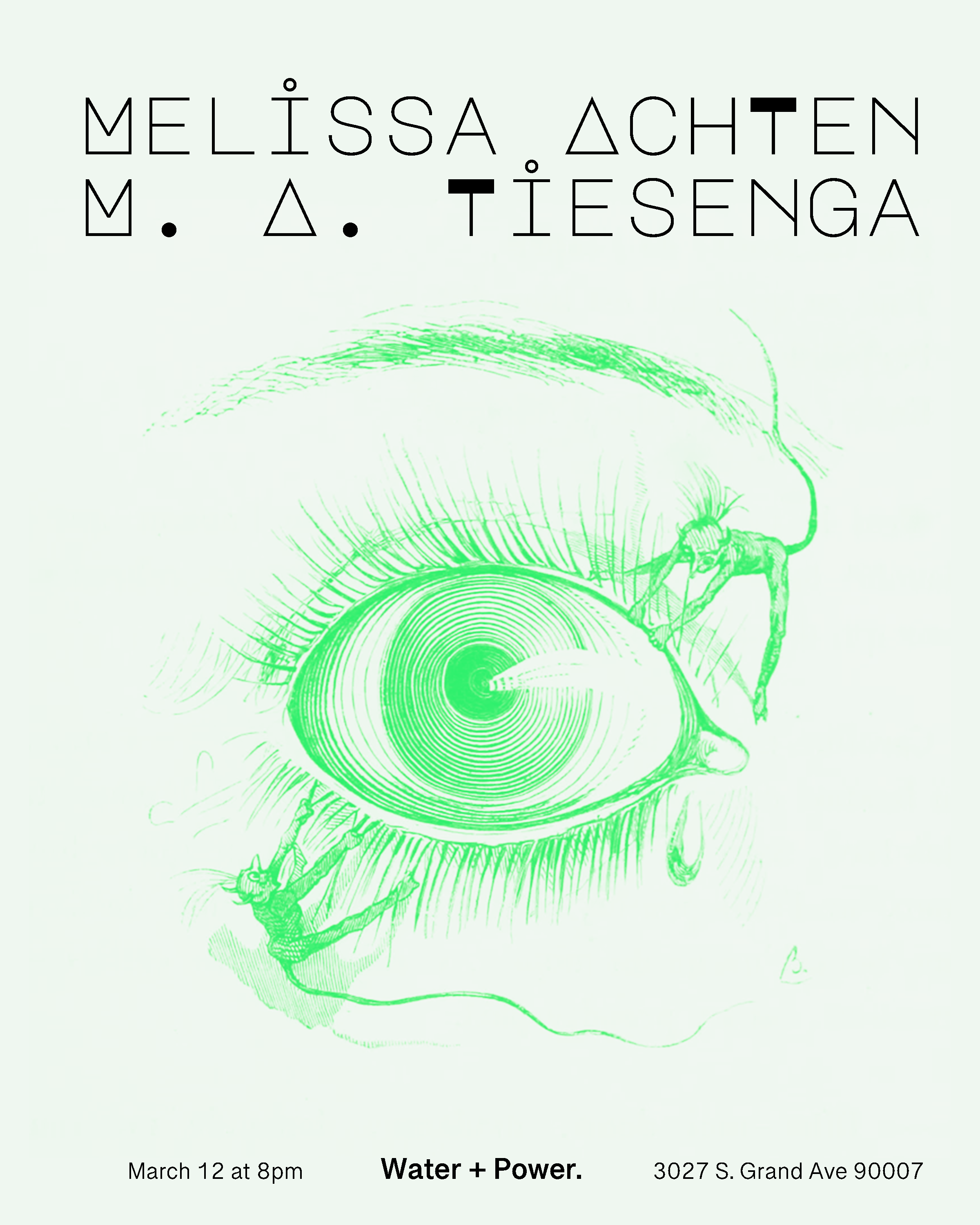 Back to All Events Melissa Achten & M. A. Tiesenga Thursday, March 12, 2026 8:00 PM 10:00 PM Water + Power 3027 South Grand Avenue Los Angeles, CA, 90007 United States (map) Google Calendar ICS
